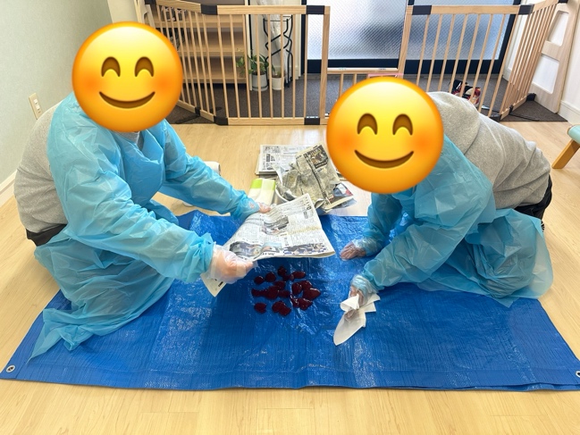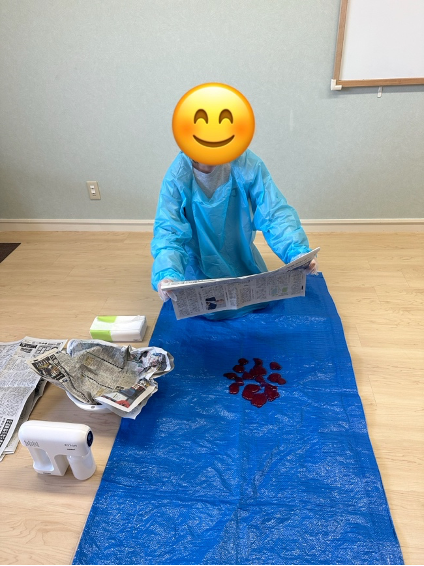 - 凝固剤の使用: 嘔吐物が広がらないよう、外側から内側へ向かって凝固剤を散布。水分を吸わせてからヘラで回収する練習を行った。